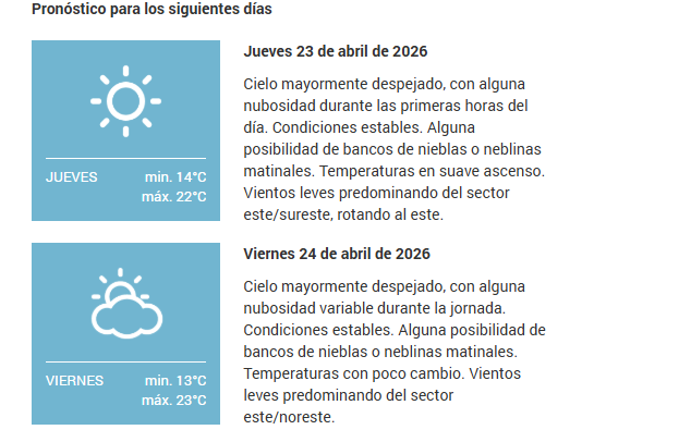 Cielo mayormente despejado, con alguna nubosidad por momentos, sobre todo durante las primeras y las últimas horas del día. Condiciones estables. Temperaturas en descenso de las mínimas y poco cambio de las máximas. Vientos leves a moderados predominando del sector suroeste, rotando al sur/sureste.