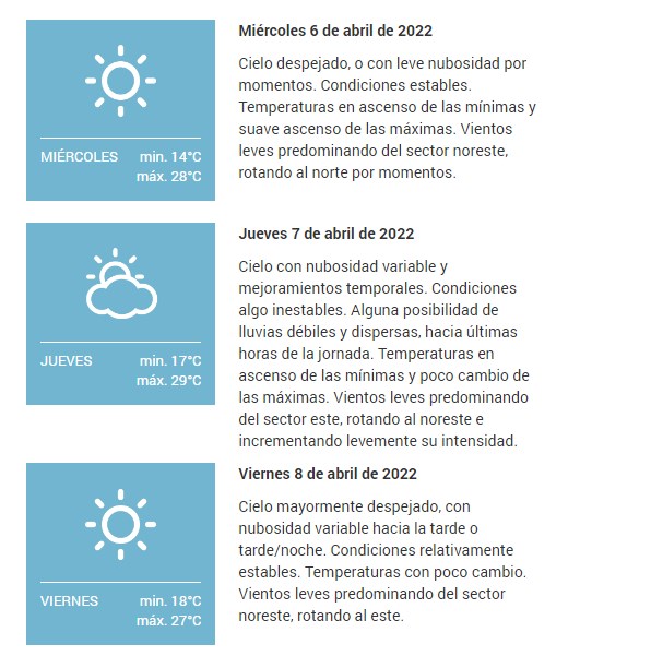 Cielo despejado, o con leve nubosidad por momentos. Condiciones estables. Temperaturas en suave descenso de las mínimas y poco cambio de las máximas. Vientos leves predominando del sector este/sureste, rotando al nor/noreste por momentos.