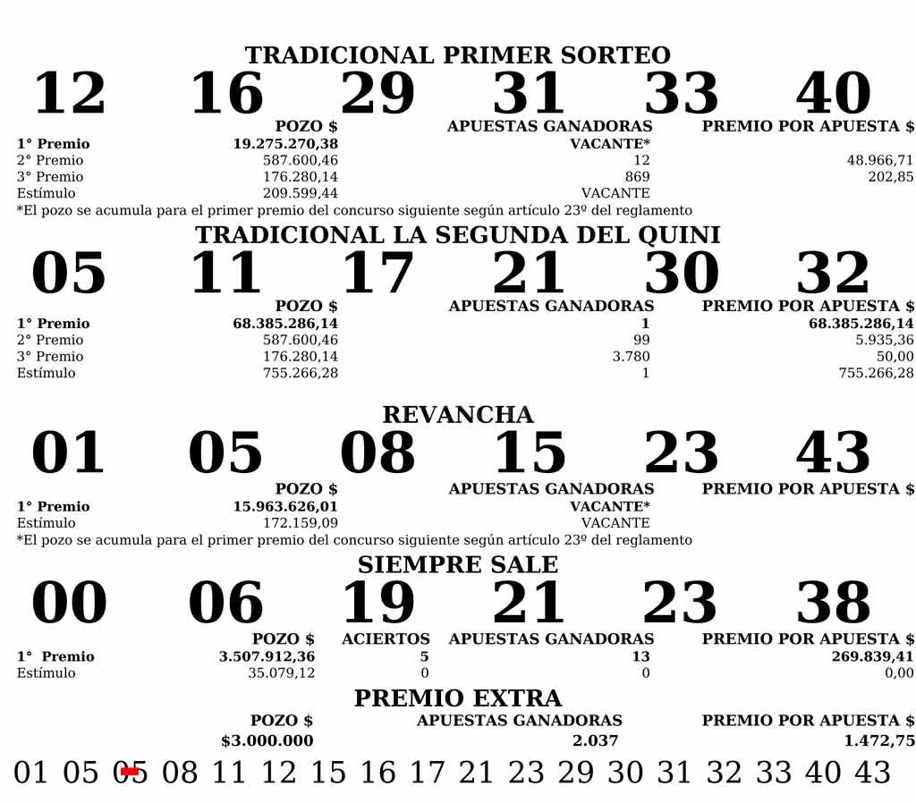 De esta manera, para el sorteo del domingo 6 de enero se espera un pozo estimado de $ 73.000.000. Recordemos que el valor de la apuesta Tradicional 1º sorteo y la Segunda es de $ 30,00. Con Revancha: $ 40,00. Con Revancha y Siempre Sale: $ 50,00.