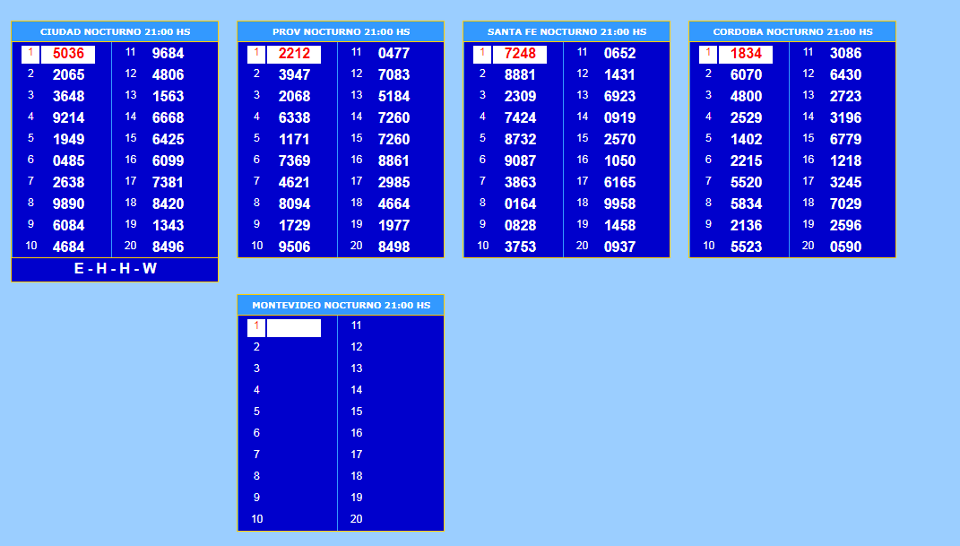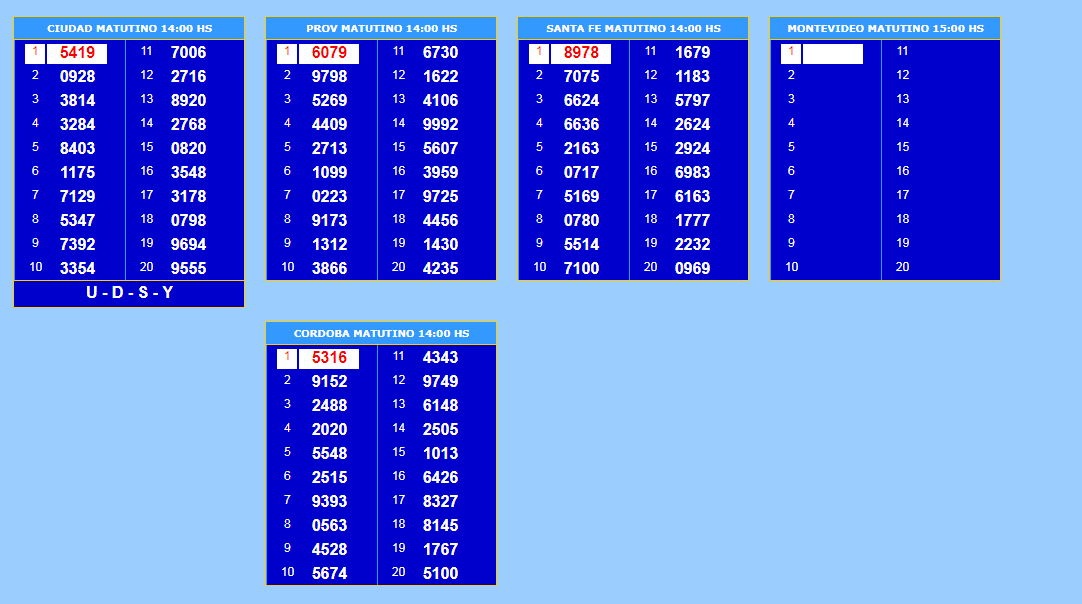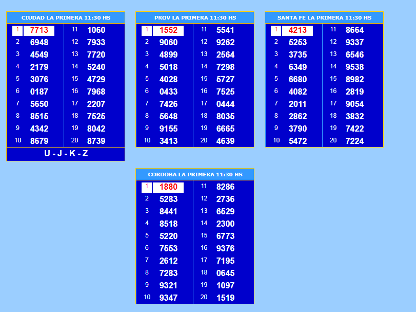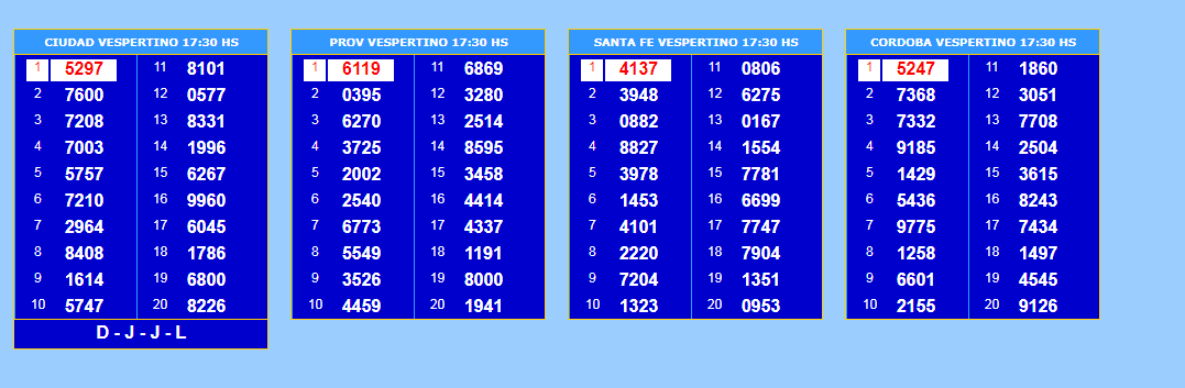 Quiniela todos los números: martes 25 de junio La Primera Matutino Vespertino Nocturno Comenta sobre esta publicación Navegación de entradas SMN: miércoles despejado y frío Rosario: Madres que elaboran aceite de cannabis van a la Corte tras un fallo en contra