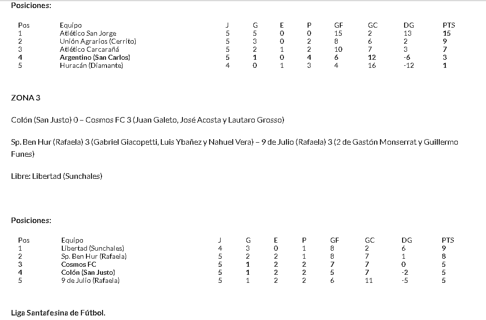 Argentino de San Carlos cayó 2 a 0 con Atlético San Jorge como visitante, mientras que Cosmos consiguió venció a Colón en San Justo por 3 a 0 y logró su primera victoria. Recordamos que el primero de cada zona avanza a la segunda fase y segundo y tercero clasifican a la primera fase.