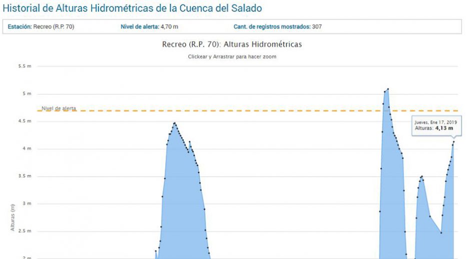 Recreo se anotó con un registro de 4,13 metros. Se muestra en continuo ascenso desde el 6 de enero cuando midió 2,47 metros. Así, en 11 días, el salado creció a la altrua de esa localidad 1,66 metros.