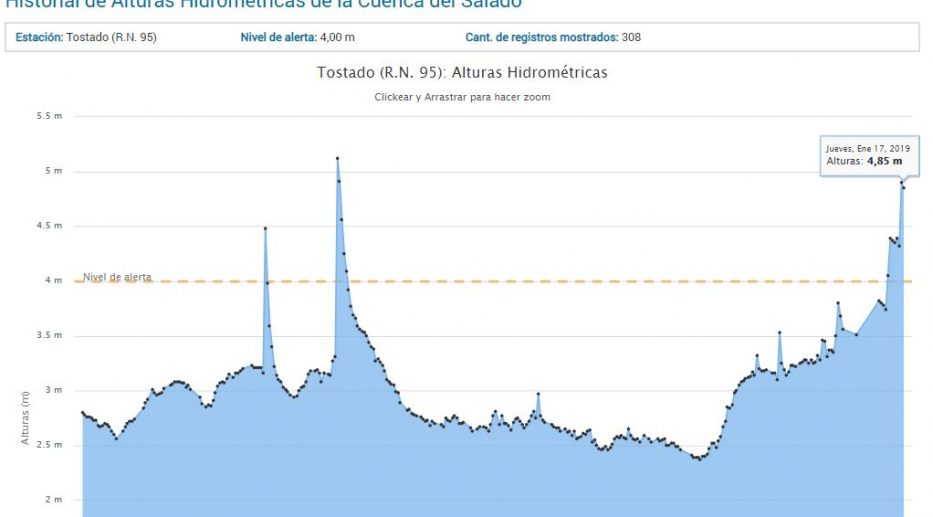 Río arriba, en Tostado, el Salado midió este jueves 4,85 metros. Bajó cinco centímetros respecto al día anterior pero pegando salto significativos en poco tiempos. En ese sentido, el 9 de enero midió 3,74 metros y dos días después se anotaba con 4,39 (se registró una suba de 60 centímetros en 48).