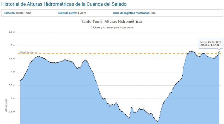 Este jueves, el Salado dejó una marca a la altura de Santo Tomé de 4,77 metros (un centímetro menos de la más alta del 2018), superando por siete centímetros el nivel de alerta que se ubica en 4,70 metros.