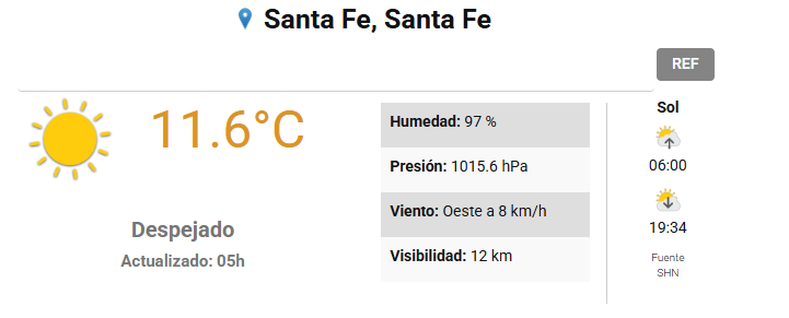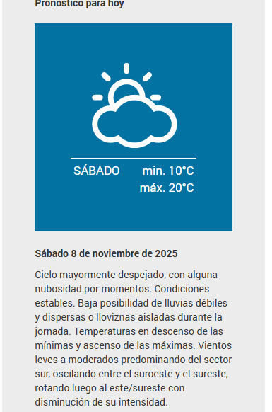 En tanto que el Centro de Informaciones Meteorológicas de la FICH – UNL pronostica para hoy sábado 8 de noviembre 2025 en la ciudad de Santa Fe de la Vera Cruz capital de la provincia de Santa Fe República Argentina.