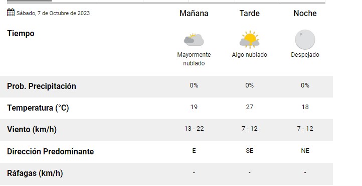 Cielo mayormente despejado, con nubosidad variable durante las primeras horas del día. Condiciones relativamente estables y mejorando. Temperaturas con poco cambio de las mínimas y suave descenso de las máximas. Vientos leves a moderados del sector sur/sureste, rotando al este/sureste y luego al nor/noreste.
