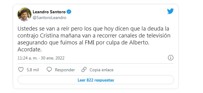 “Ustedes se van a reír, pero los que hoy dicen que la deuda la contrajo Cristina mañana van a recorrer canales de televisión asegurando que fuimos al FMI por culpa de Alberto. Acordate”, sostuvo el diputado nacional en su cuenta de Twitter.