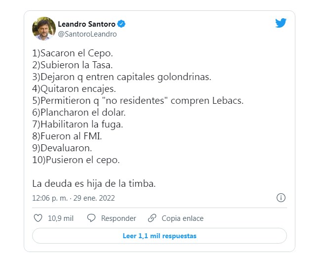 Santoro describió: “Sacaron el cepo, subieron la tasa, dejaron que entren capitales golondrinas, quitaron encajes, permitieron que ‘no residentes’ compren Lebacs, plancharon el dólar, habilitaron la fuga, fueron al FMI, devaluaron, pusieron el cepo. La deuda es hija de la timba”.