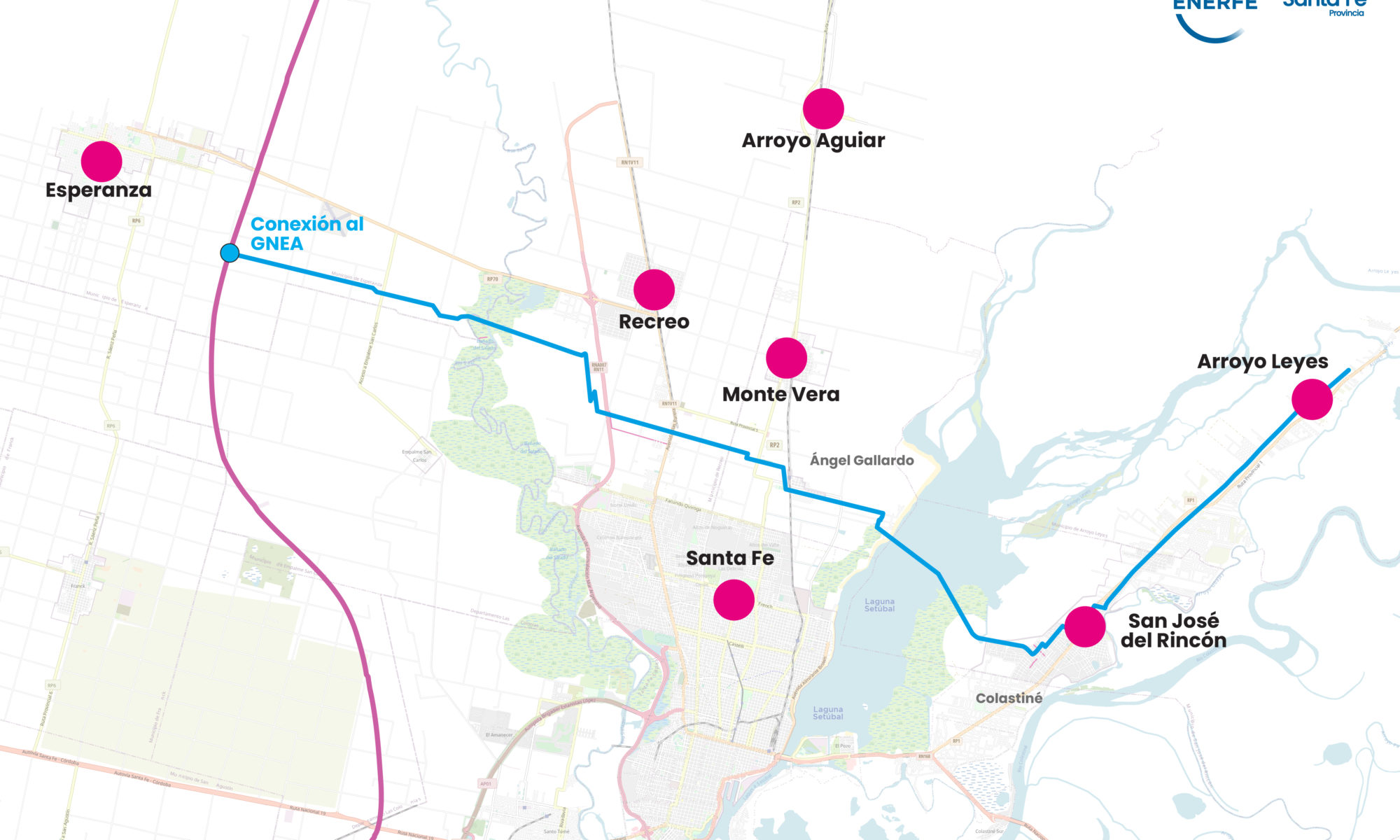 “El gasoducto del GNEA que pasa cerca de la ciudad de Esperanza que va desde la localidad de San Gerónimo en la provincia de Santa Fe hasta Bolivia porque originalmente fue un gasoducto originalmente pensado para importar gas cuando la Argentina no tenía gas. Hoy Argentina tiene Vaca Muerta tiene gas para autoabastecerse y exportar entonces estamos usando ese gasoducto como un gasoducto de distribución, desde allí nos vamos a tomar nosotros en la ciudad de Esperanza y vamos a ir a la localidad de Recreo, Monte Vera, Arroyo Aguiar pasando por el norte de la ciudad de Santa Fe para llegar a todo el corredor de la costa entiéndase el barrio de Colastiné, la localidad de San José del Rincón y Arroyo Leyes”.
