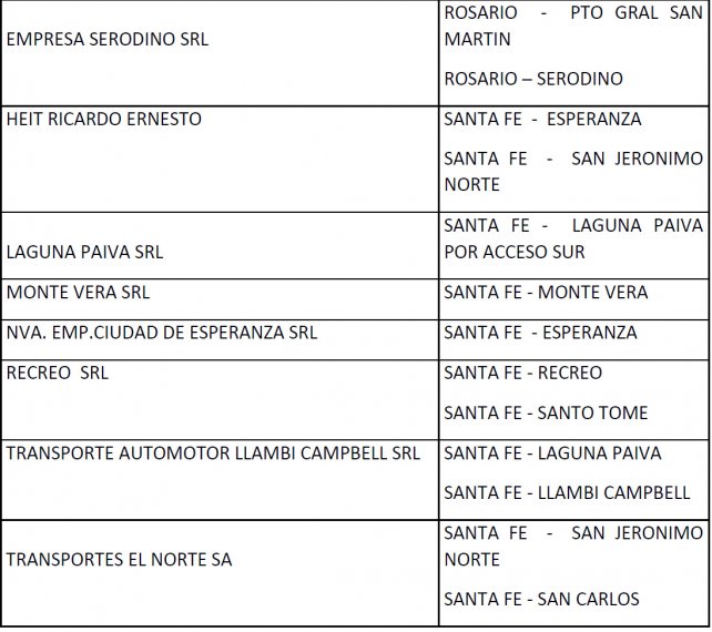 Asimismo, las empresas exceptuadas por el artículo 2º de la Resolución Nº 003/2020 S.T (aquellas que prestan servicio en las áreas metropolitanas de Rosario y Santa Fe que no viajan a más de 60 km desde estas ciudades) deberán prestar servicios hasta las 24 del 26 de abril, con frecuencias y programaciones habituales de día feriado. En tanto que las modificaciones de cuadros horarios deberán ser notificadas por las empresas a los usuarios con antelación suficiente.