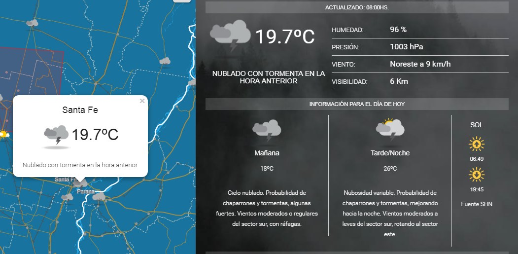 Nubosidad variable. Probabilidad de chaparrones y tormentas, mejorando hacia la noche. Vientos moderados a leves del sector sur, rotando al sector este. Temperatura máxima de 26ºC
