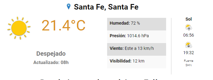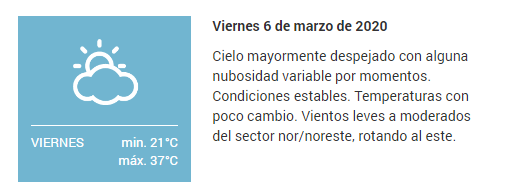 Las condiciones son estables. En el día de la fecha, se observa en la región que se mantienen las condiciones atmosféricas de los últimos días, por lo que las jornadas deberían mostrarse con condiciones estables, secas y calurosas, con temperaturas oscilando entre los 20° y los 23° de mínimas y los 36° a 40° de máxima pudiendo llegar a los 42 o 43° hacia comienzos de la semana. A priori, nuevamente no se esperan lluvias durante la semana. Por lo que se prevé para el área de influencia y en lo que resta de la jornada: