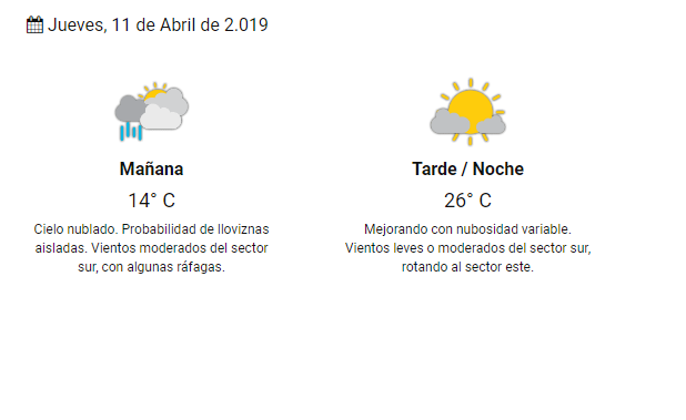 Por la Mañana: Cielo nublado. Probabilidad de lloviznas aisladas. Vientos moderados del sector sur, con algunas ráfagas. Mínima de 14ºC