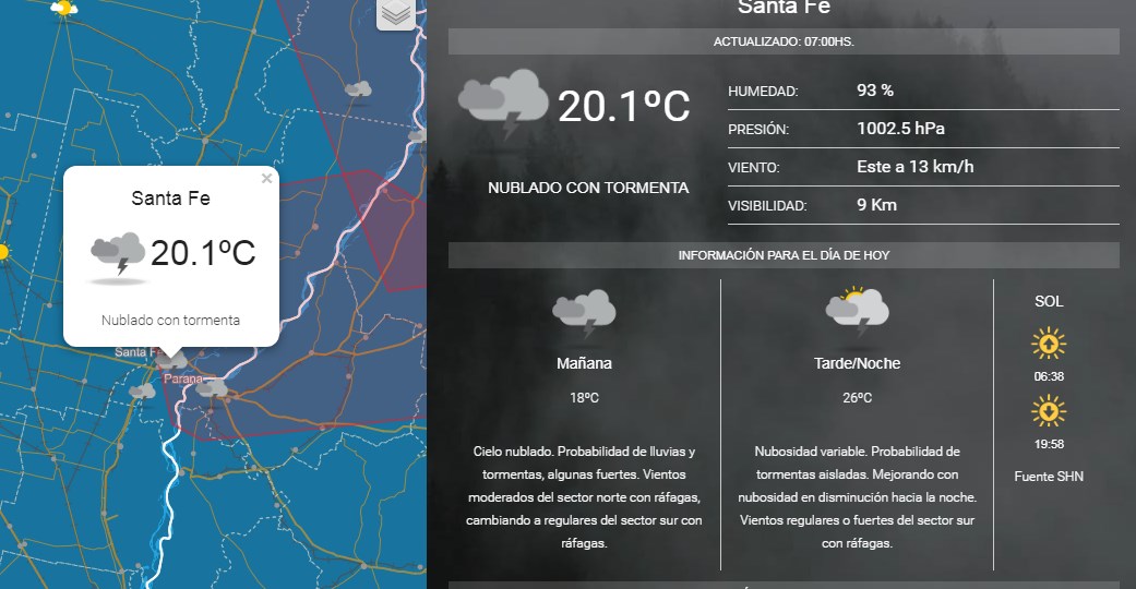 Cielo nublado. Probabilidad de lluvias y tormentas, algunas fuertes. Vientos moderados del sector norte con ráfagas, cambiando a regulares del sector sur con ráfagas. Temperatura mínima:18ºC