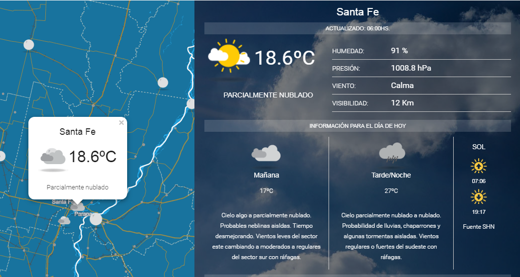 Cielo algo a parcialmente nublado. Probables neblinas aisldas. Tiempo desmejorando. Vientos leves del sector este cambiando a moderados a regulares del sector sur con ráfagas. Temperatura mínima de 17ºC