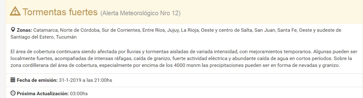 La advertencia comprende además a Catamarca, norte de Córdoba, sur de Corrientes, Entre Ríos, Jujuy, La Rioja, oeste y centro de Salta, San Juan, oeste y sudeste de Santiago del Estero y Tucumán.