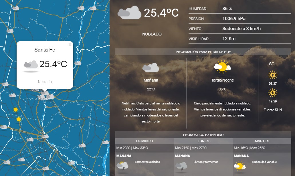 Neblinas. Cielo parcialmente nublado o nublado. Vientos leves del sector este, cambiando a moderados o leves del sector norte. Temperatura mínima de 22ºC