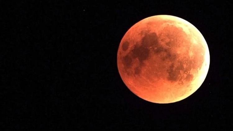 La Tierra estaría en Fase de Nueva, totalmente oscura, pero su contorno lo veríamos rojizo: es la atmósfera iluminada por el Sol desde del fondo del cielo. Las longitudes más largas de la luz filtrada por la atmósfera terrestre que van hacia los colores más fríos del espectro, tiñen de rojo a la Luna.