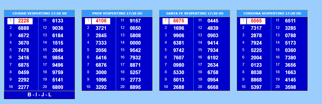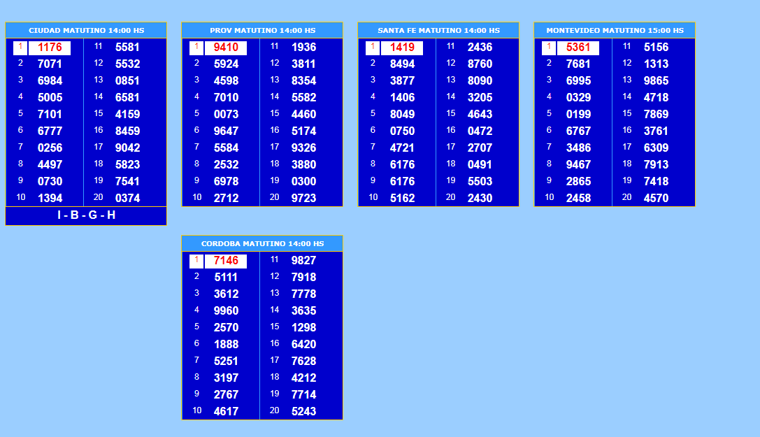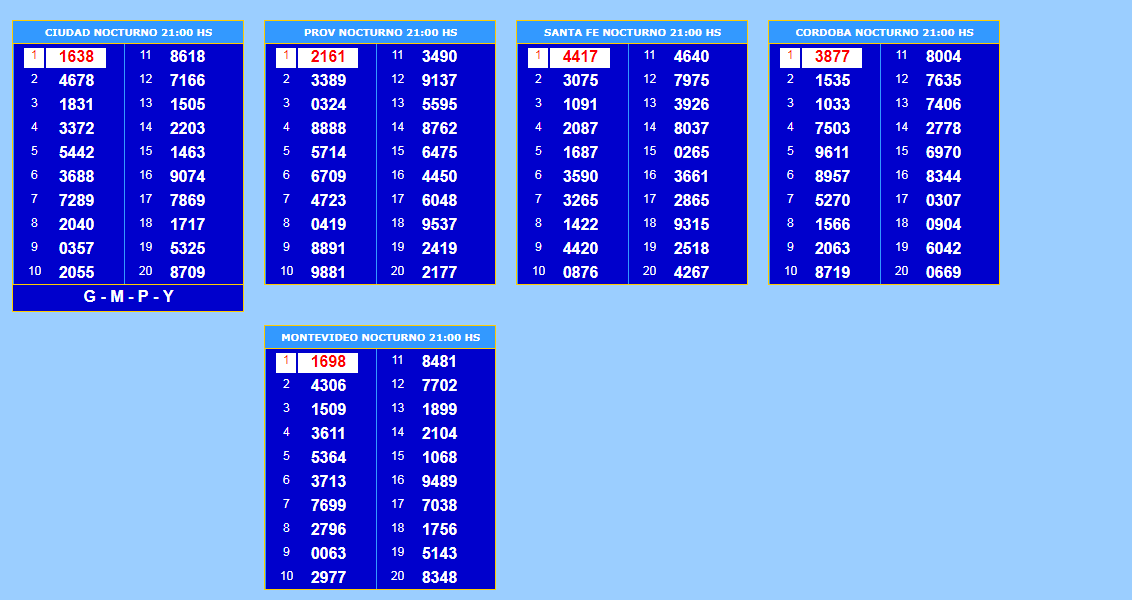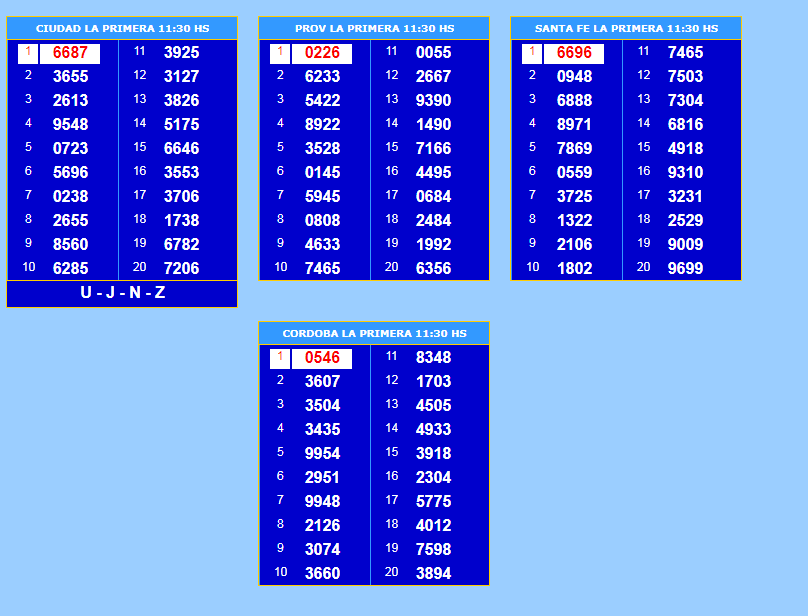 Todas las quinielas del jueves 2 de mayo La Primera Matutino Vespertino Nocturno Comenta sobre esta publicación Navegación de entradas Farmacias de turno: viernes 3 de mayo Proyección de la película Todos son mis hijos en el auditorio de ATE
