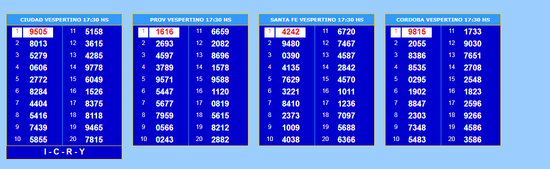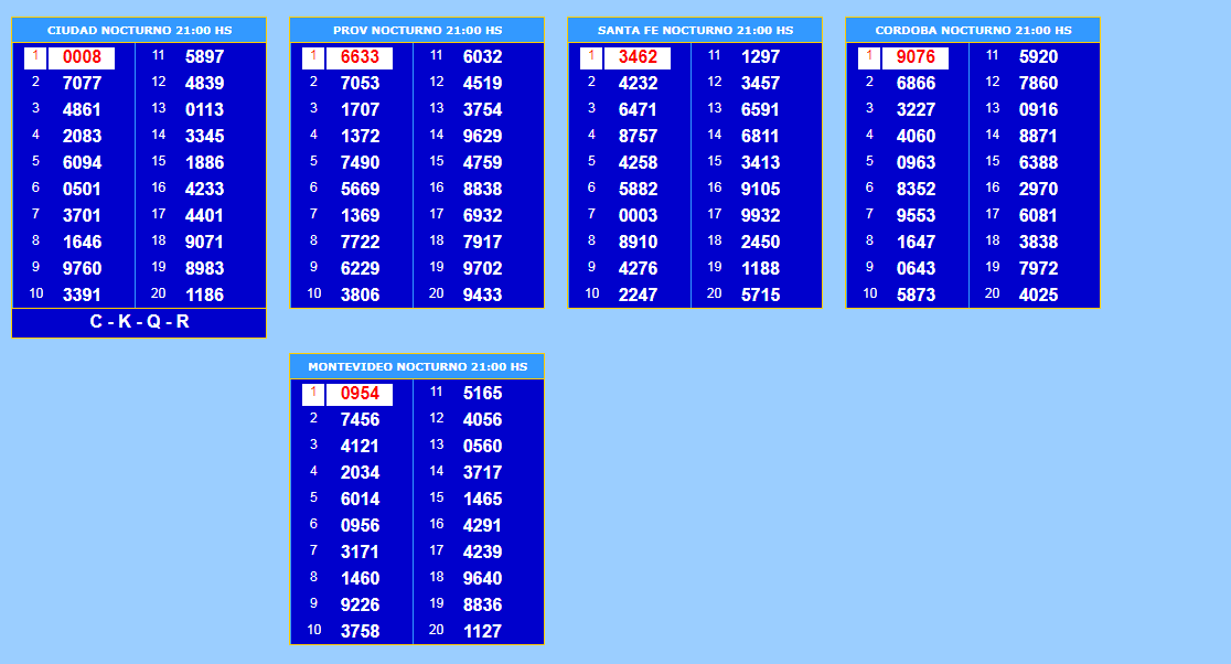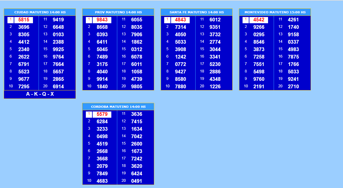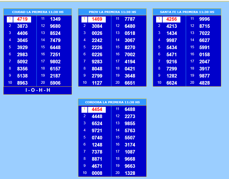 Todas las quinielas del miércoles 10 de abril La Primera Matutino Vespertino Nocturno Comenta sobre esta publicación Navegación de entradas Quini 6 los números del sorteo nº 2661 miércoles 10 de abril Pullaro descartó que la deuda por coparticipación se cancele con más fuerzas federales