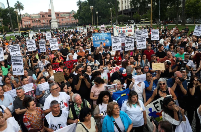 «Nunca el capital por sobre la vida». El cartel está tatuado a mano. Se puede leer en el escenario montado en la Plaza de Mayo por los trabajadores del Hospital Garrahan y el Foro Permanente por la Discapacidad. Un «abrazo simbólico» es la consigna que une a las organizaciones en la tarde del miércoles frente a la motosierra en áreas de salud pediátrica y discapacidad. El mensaje es contra la falta de fondos, la desidia y el odio del gobierno nacional.