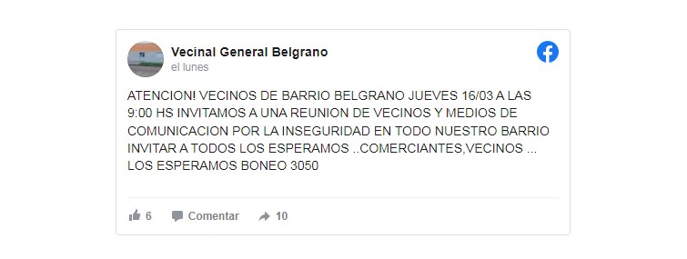 Hoy jueves 16 de marzo 2023 , a las 9, en la Vecinal General Belgrano, se hará una reunión de urgencia por el asesinato de Oscar Baños, quien fue apuñalado el domingo en su local comercial por un hombre que el día anterior había ayudado. El comerciante, que fue trasladado de urgencia al Cullen, falleció el martes cerca de las 16.
