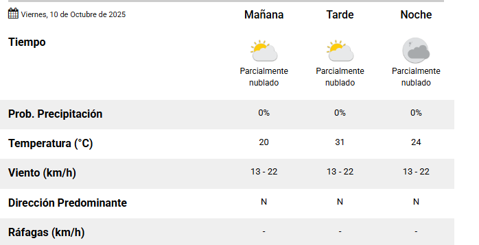 Cielo mayormente despejado, con nubosidad variable en aumento. Condiciones relativamente estables, con tendencia gradual a inestabilizarse. Temperaturas en gradual ascenso. Vientos moderados del sector norte/noreste, incrementándose a regulares por momentos, durante el transcurso de la jornada.