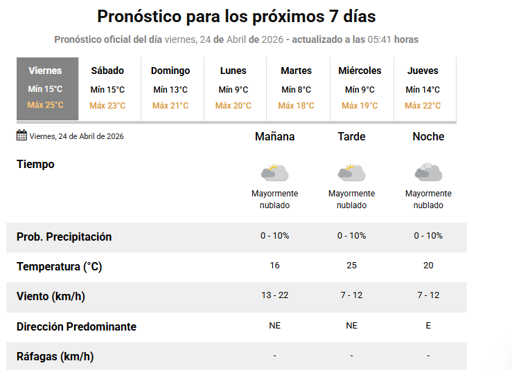 El SMN pronostica para hoy viernes 24 de abril 2026 en la ciudad de Santa Fe de la Vera Cruz capital de la provincia de Santa Fe República Argentina.
