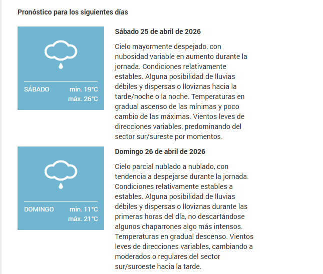 Cielo mayormente despejado, con nubosidad variable durante la jornada, sobre todo durante las primeras horas del día. Condiciones estables. Alguna posibilidad de bancos de nieblas o neblinas matinales. Temperaturas en ascenso de las mínimas y poco cambio de las máximas. Vientos leves de direcciones variables, predominando del sector este por momentos.