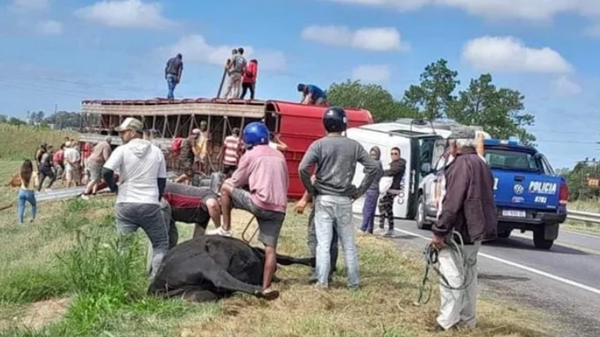 Fuentes policiales aseguraron que “la situación pudo ser controlada sin que haya ninguna persona lesionada“. Y en esa misma línea indicaron que “luego del siniestro llegaron al lugar más de cien personas de la zona, pero no se registraron incidentes y el propio dueño de la hacienda autorizó a que faenar los animales a la vera de la ruta y se llevan la carne”.
